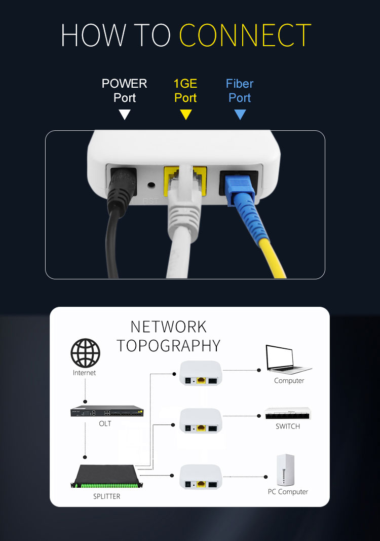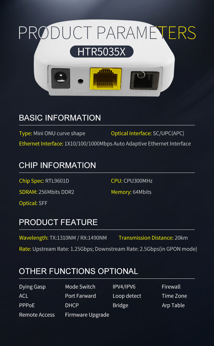 | PON Arayüzü | 1GPONSFF Alma hassasiyeti: ≤-27dBm Optik güç aktarımı. 0~+5dBm İletim mesafesi: 20KM |