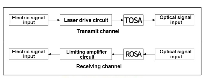 Its working principle is the electrical interface input of the transmitting channel, the coupling of the electrical signal is completed through the electrical interface circuit, and then the laser driving circuit in the transmitting channel is modulated, and then the impedance matching part is used for impedance matching to complete the modulation and drive of the signal, and finally Send the laser (TOSA) electro-optical conversion into optical signal for optical signal transmission.